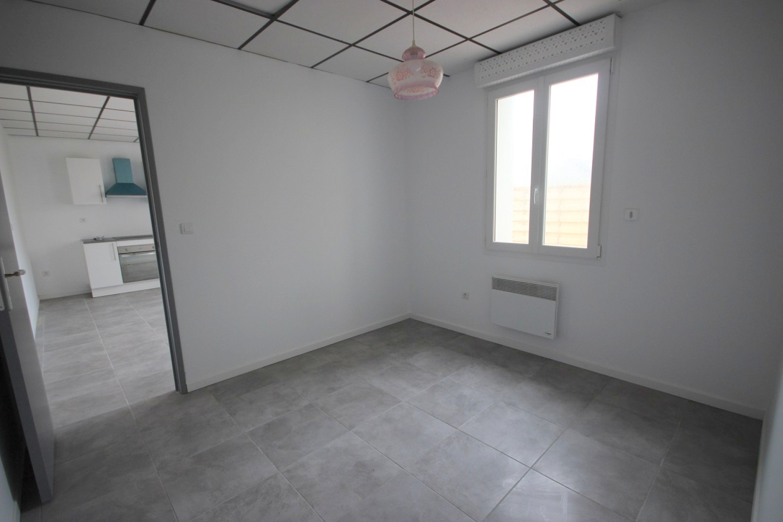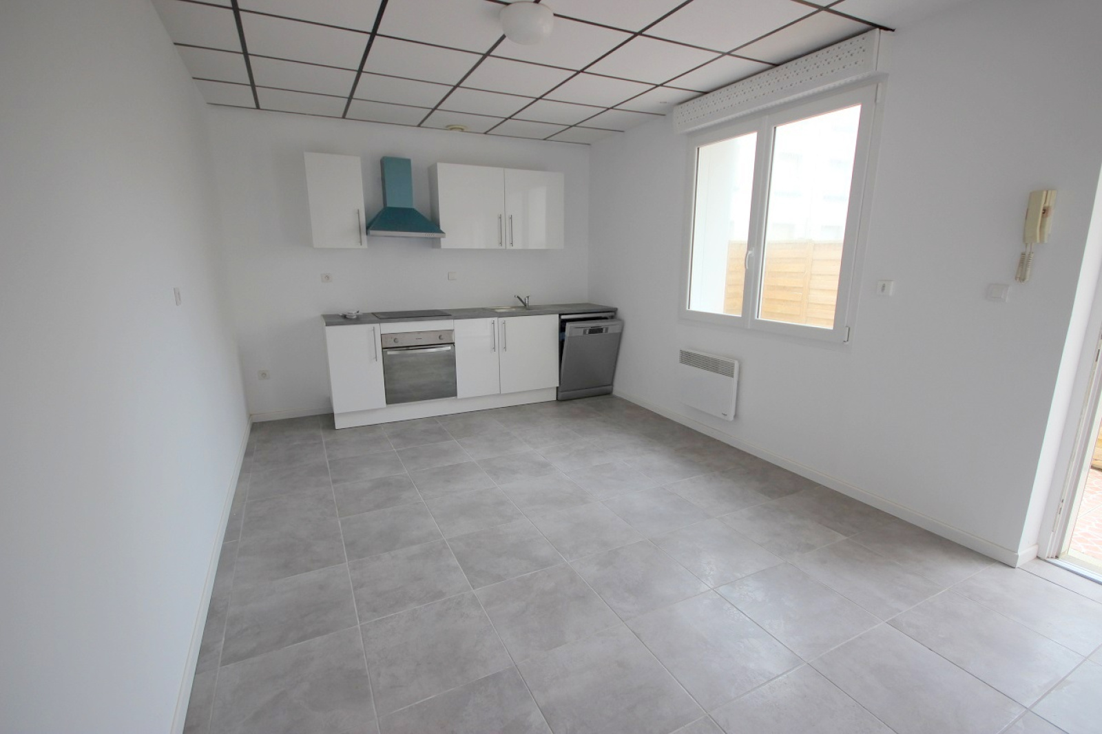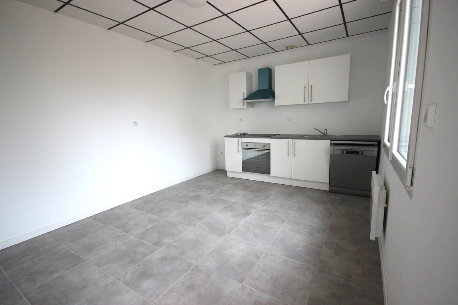 - séjour avec cuisine ouverte semi équipée (four, plaque de cuisson, hotte aspirante, lave vaisselle)